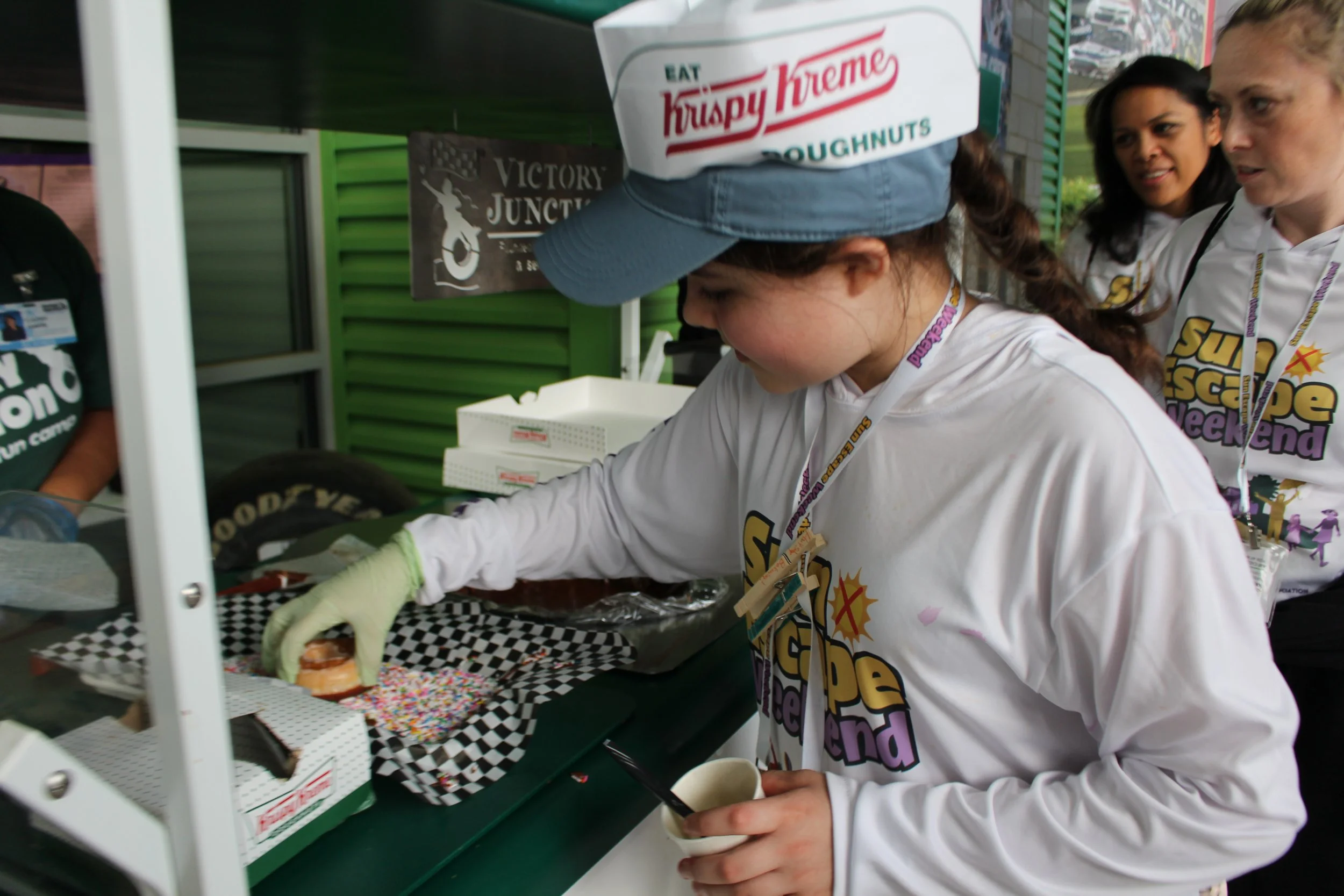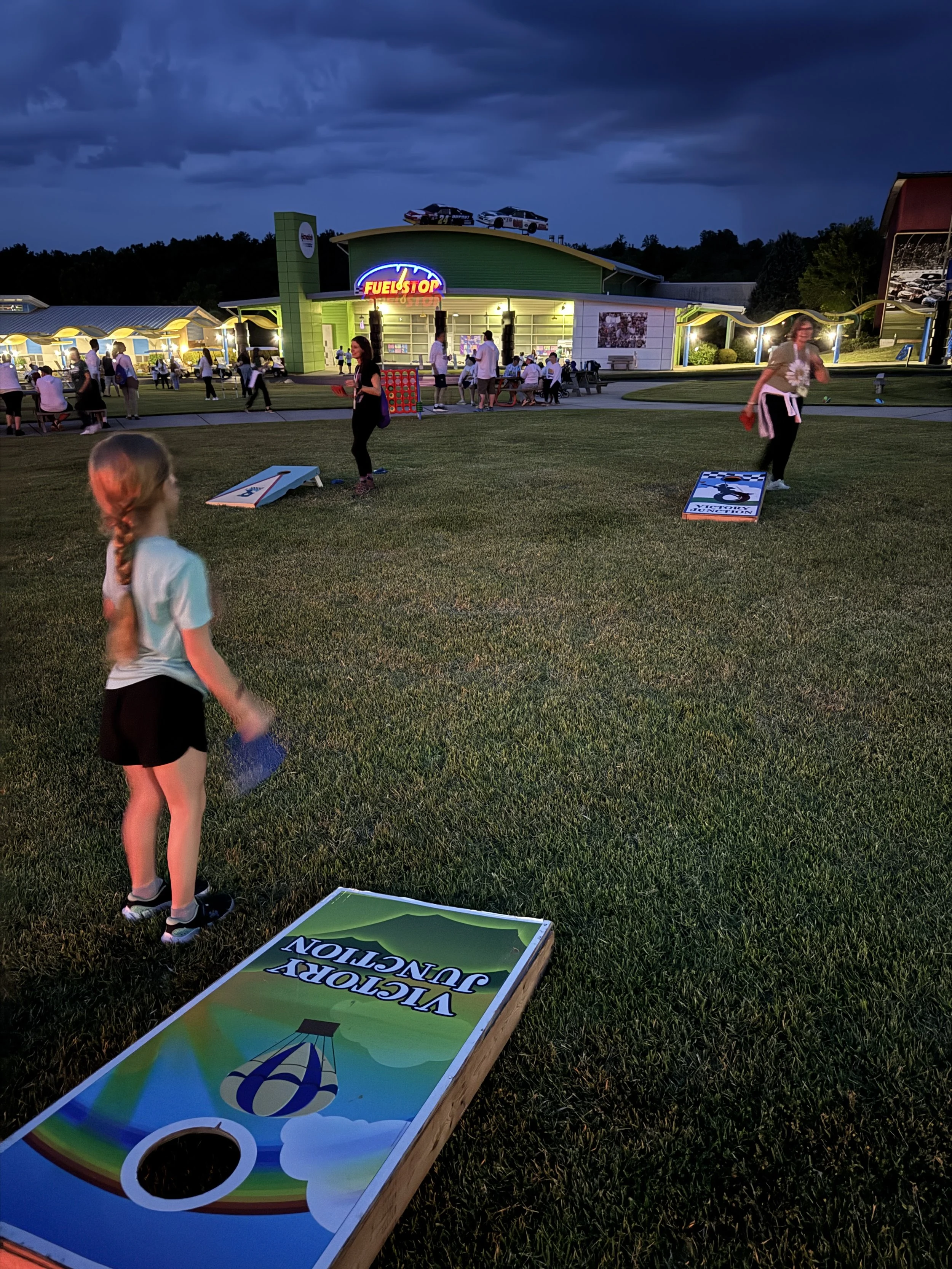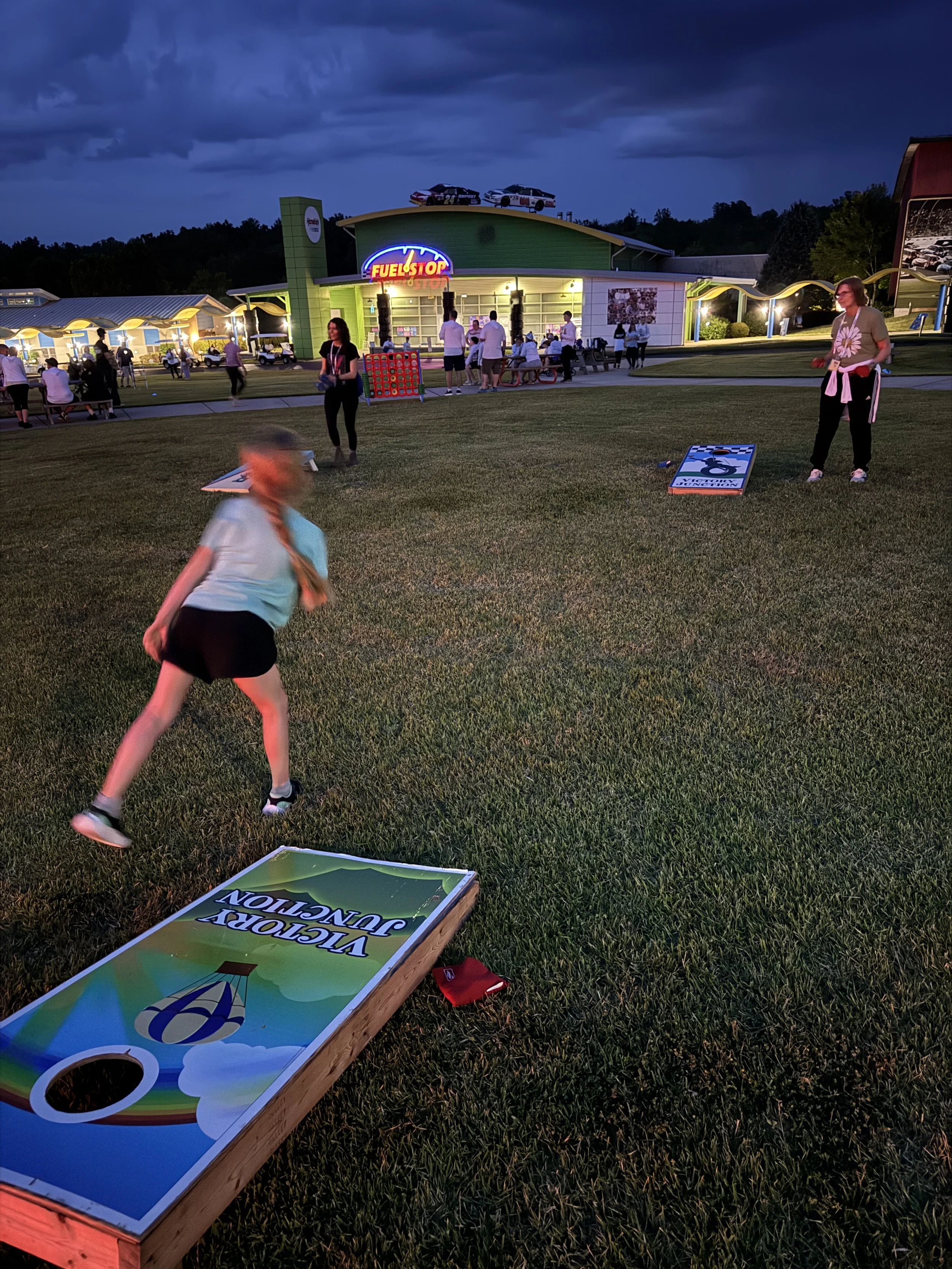 Throughout the weekend, our 32 families enjoyed various traditional activities such as horseback riding, archery, the superdome, fishing, and more. As the sun set on Saturday night, we launched the NASCARnival on the Victory Junction Lawn, treating campers to inflatable boardwalk games, a dunk tank, tasty Krispy Kreme donuts, a live DJ, pies in the face, and more. Portable lights were brought in to keep the festivities alive even after dark. Unfortunately, thunderstorms on Friday and Saturday evenings significantly impacted both our carnival and outdoor activities.