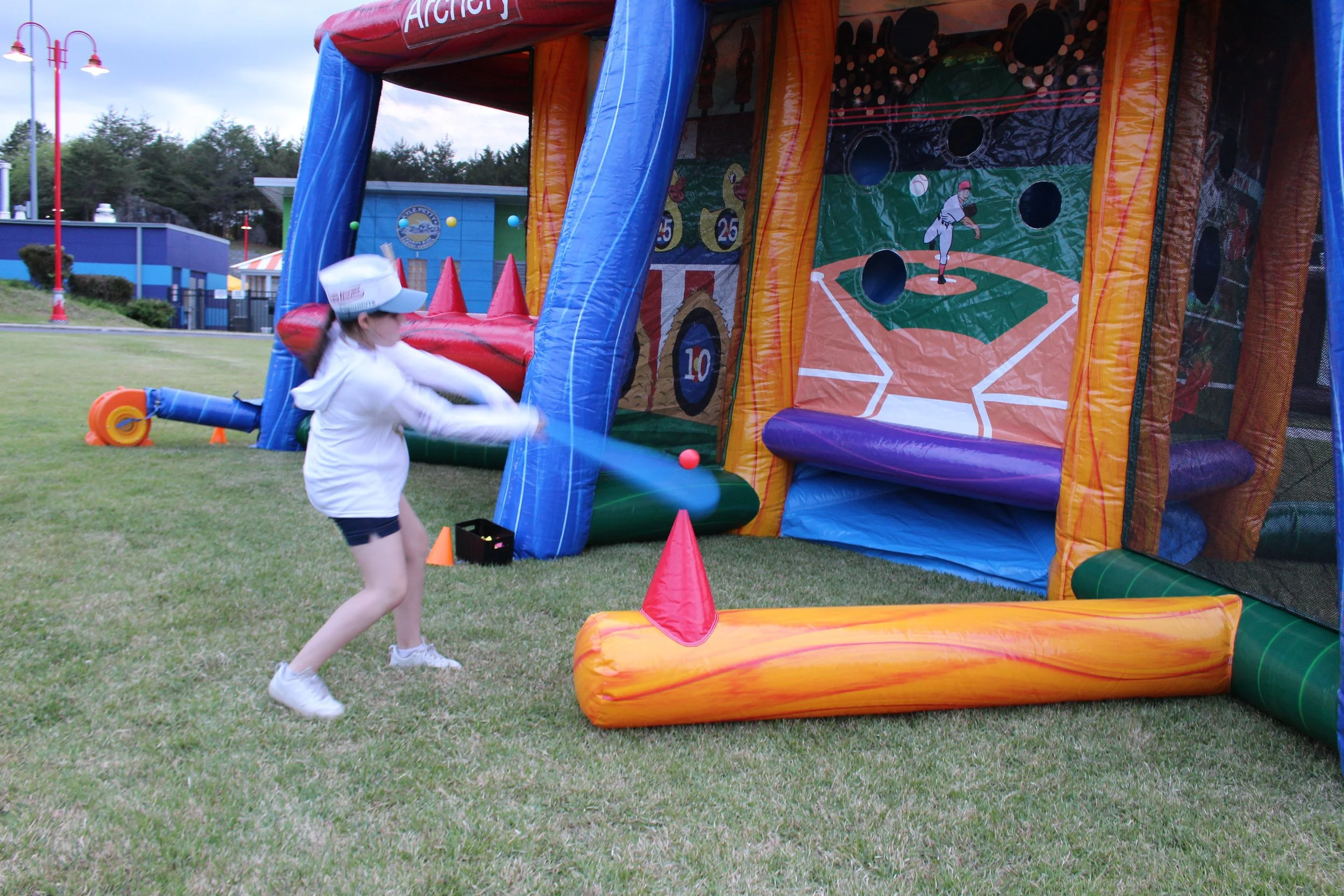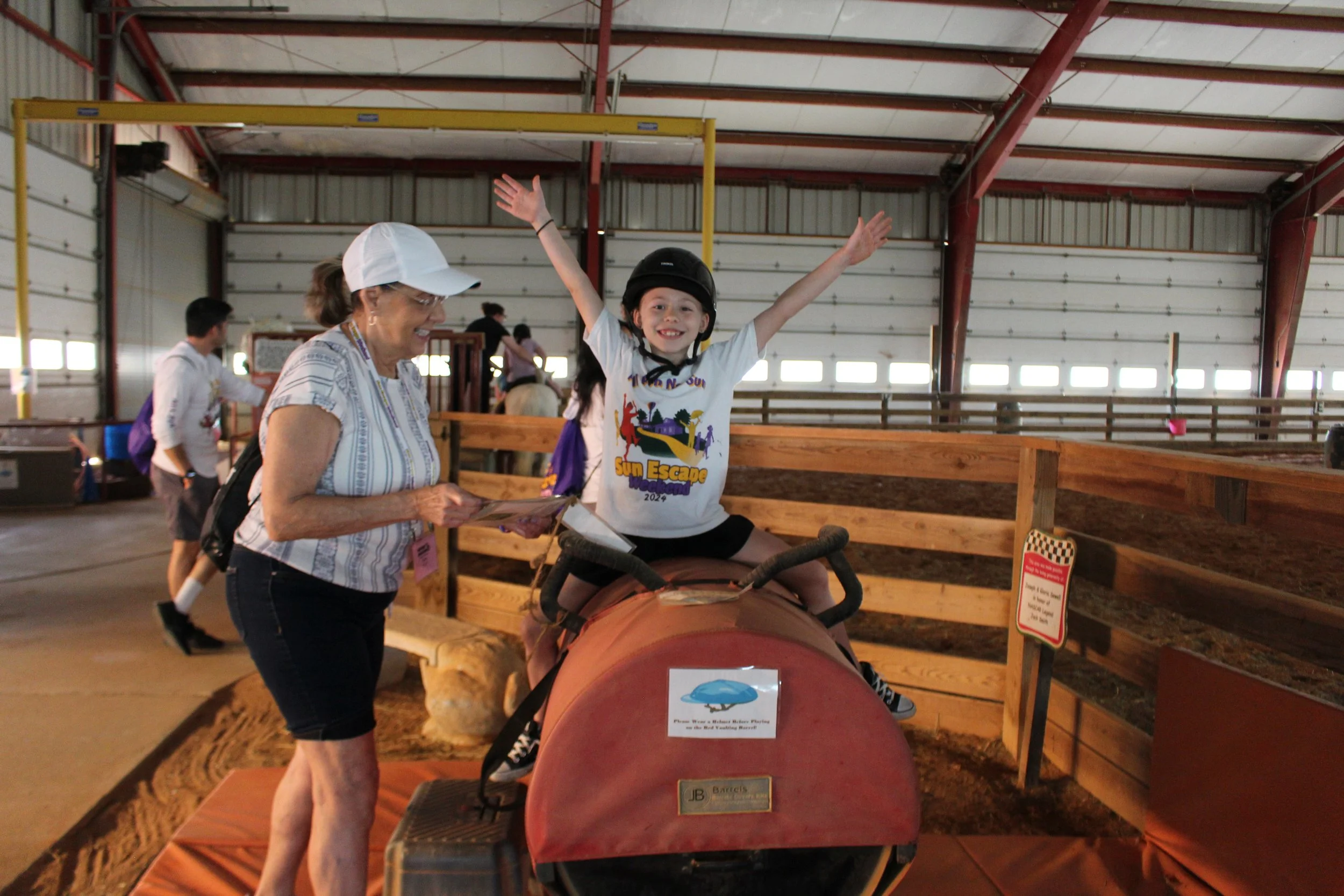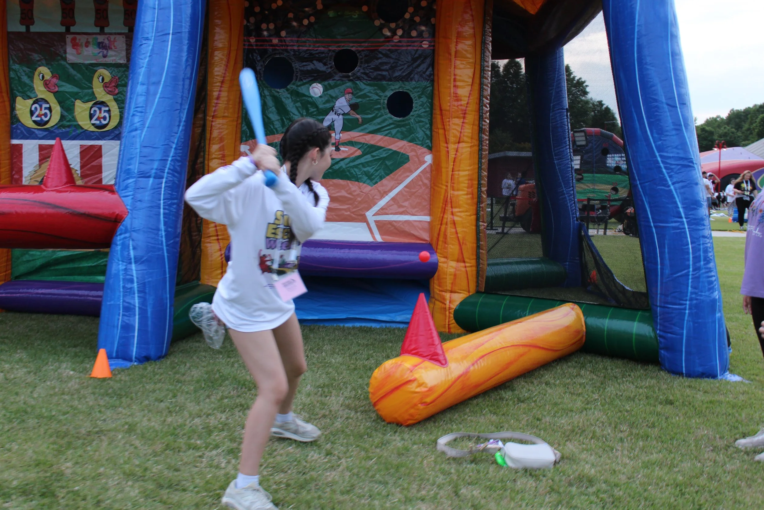Throughout the weekend, our 32 families enjoyed various traditional activities such as horseback riding, archery, the superdome, fishing, and more. As the sun set on Saturday night, we launched the NASCARnival on the Victory Junction Lawn, treating campers to inflatable boardwalk games, a dunk tank, tasty Krispy Kreme donuts, a live DJ, pies in the face, and more. Portable lights were brought in to keep the festivities alive even after dark. Unfortunately, thunderstorms on Friday and Saturday evenings significantly impacted both our carnival and outdoor activities.